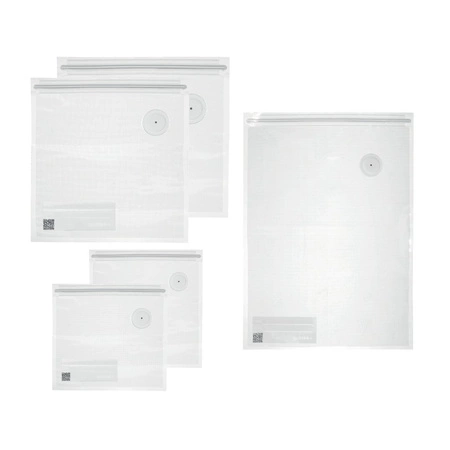 - Zestaw 5 worków próżniowych z zaworem i miejscem na etykietę daty. Różne rozmiary, wielokrotnego użytku, idealne do lodówki, zamrażarki i mikrofalówki.